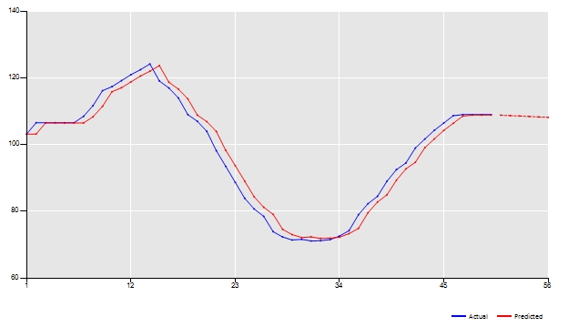 A first check of the goodness of fit of our model could be done by inspecting the line plot chart. A good fit will put the red line (predicted values) near to the blue line (actual values). The dotted line represents the out of sample prediction of our model.
