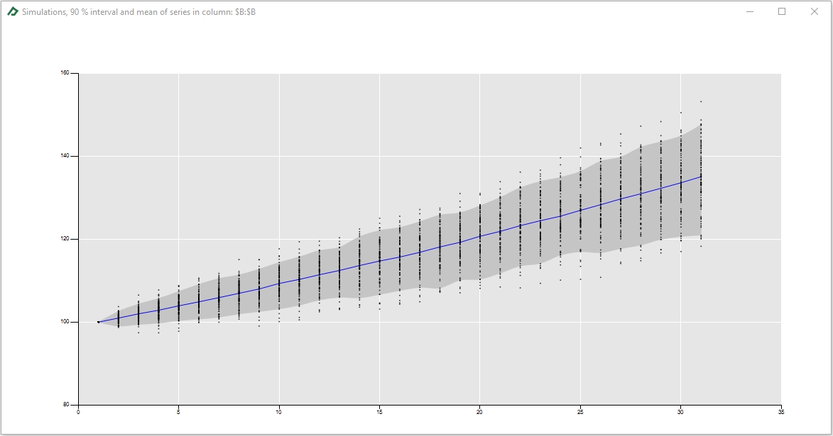 In this chart, the dots represent the simulated values of the time series for each time of the simulation. The blue line is the mean of the simulations and the grey area is the 5%-95% interval of the simulated values of the time series.
