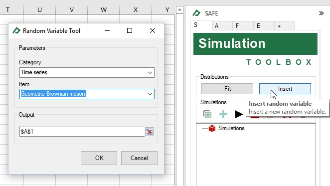 To demonstrate the generation of a time series, let’s generate a Geometric Brownian Motion using the insert button (see picture below). The first step is to select the Geometric Brownian Motion under the time series and then chose a destination cell to receive the series, let's say, cell A1.
