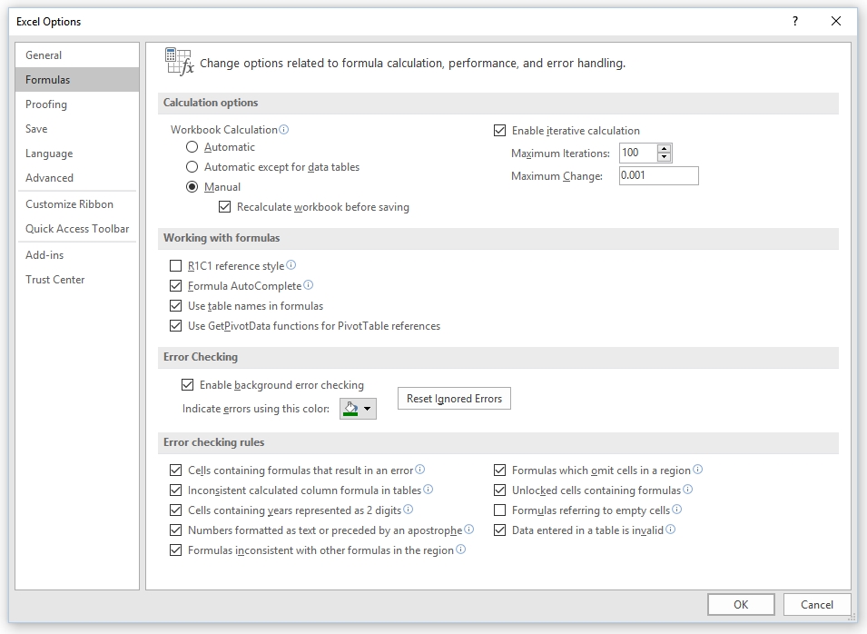 Let’s first do the trick before entering in some details on how it works. First of all, after configuring a random variable, go to the Excel options and check the box “Enable iterative calculation”, change the calculation to manual and then define the number of desired simulations in the field “Maximum iterations”.