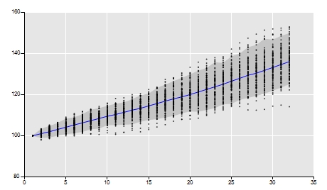 In some cases, the area will represent random time series vectors. With that in mind, the chart plots this vector in a very meaningful fashion. In this chart, the blue line represents the mean of each cell and the gray area represents the interval between the percentiles 5% and 95%.