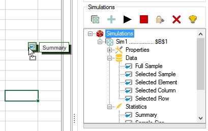 Besides the predefined analysis that follows every simulation, a plenty of spreadsheet functions is available to facilitate working with the results. Most of these functions can be inserted just expanding the tree view of the selected simulation and then dragging and dropping the desired output on the spreadsheet.
